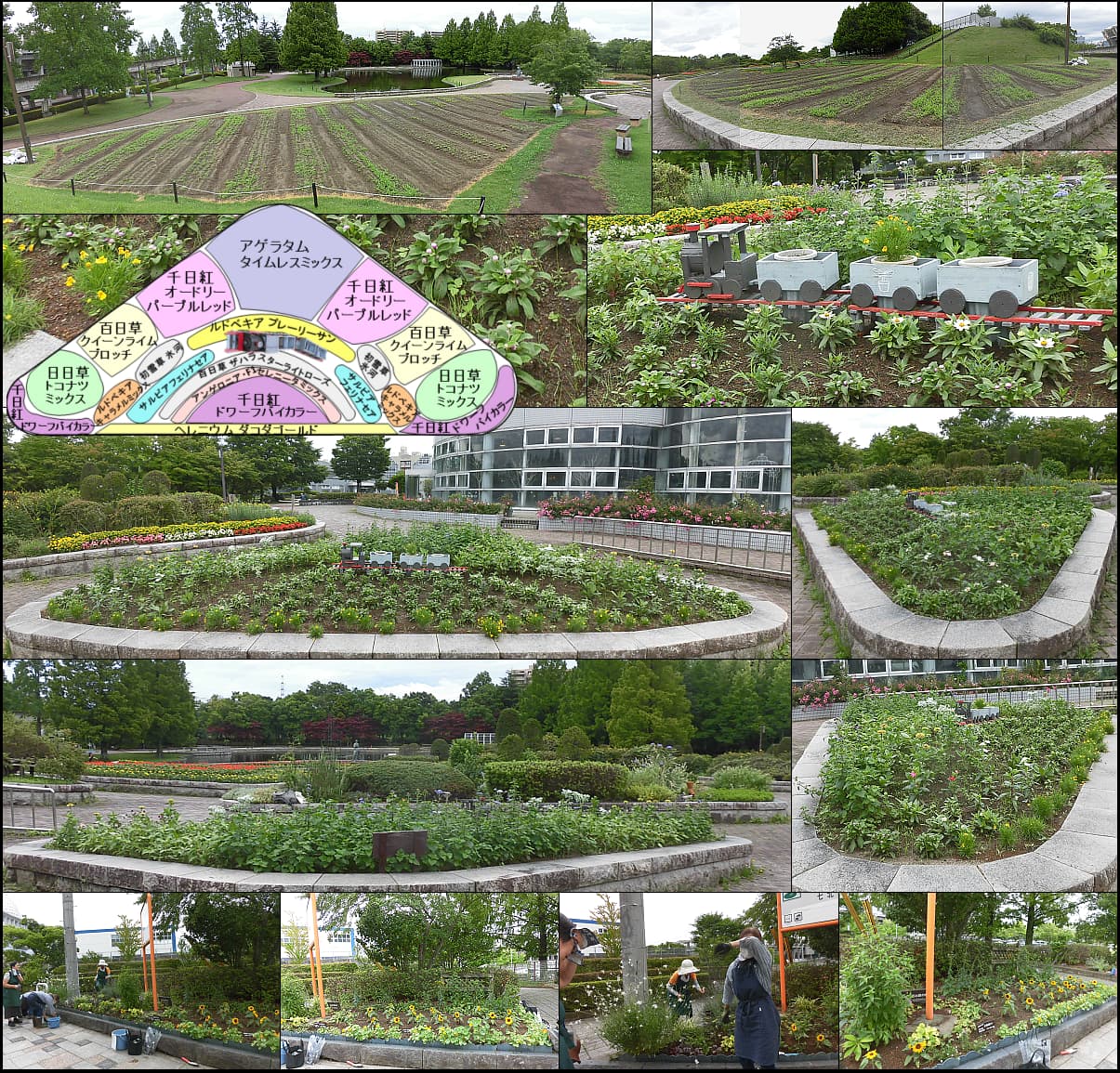 例会、植込みから約1ヶ月、適度に雨も降って咲き揃ってきました。雑草取ってさっぱりしました。桜守花壇も成長中。