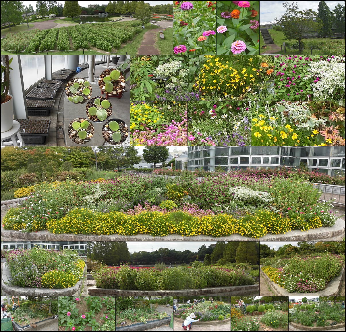 例会32℃。伸びて高さが揃った千日紅、キャラメル色が素敵なルドベキア、黄色のヘレニウムも見事。桜守花壇にはジニア。雨が!?