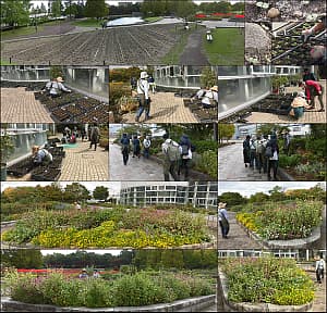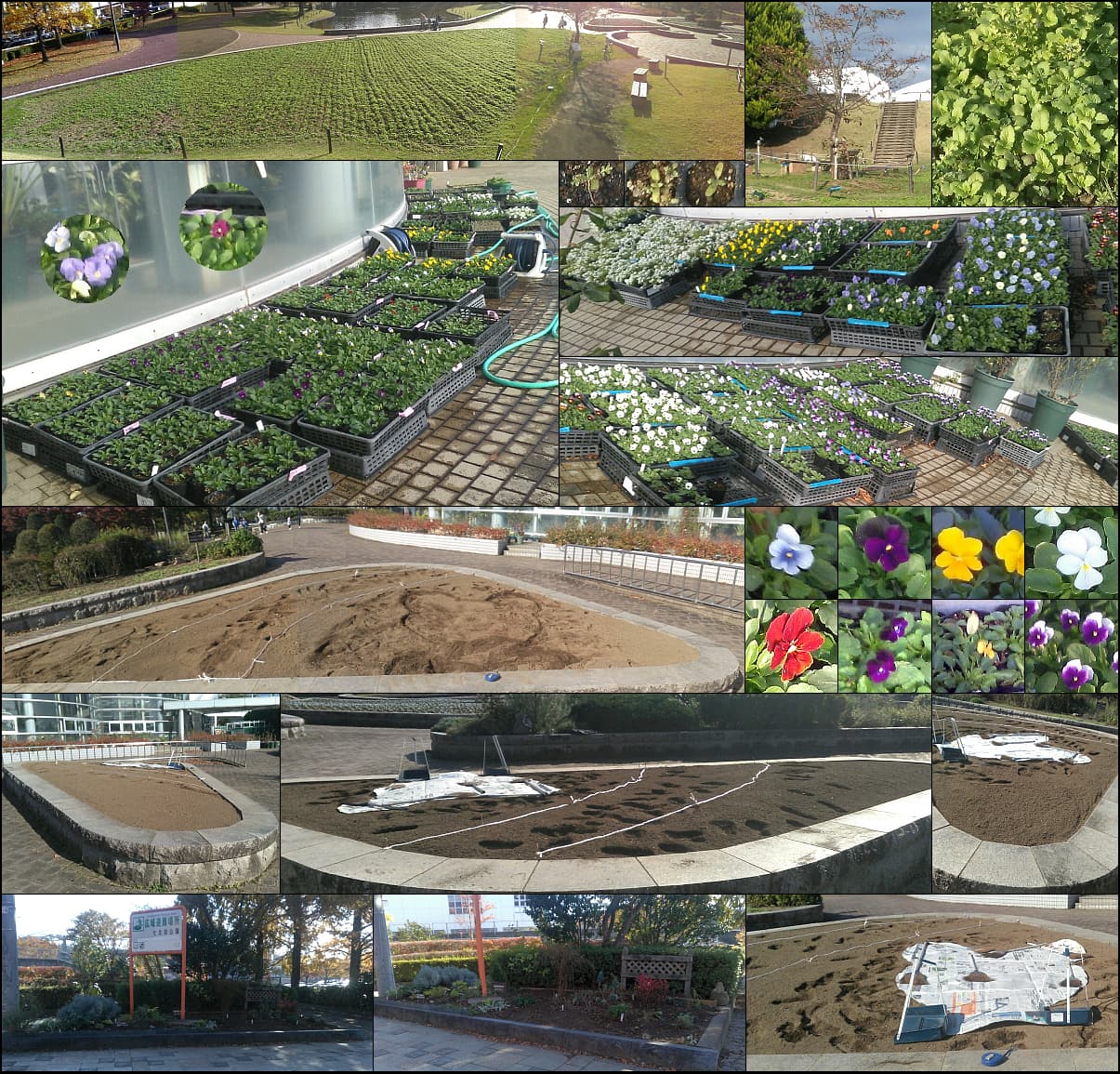 ビオラは葉が増え、プラグトレイのネモフィラも発芽。三角花壇は3日後に引抜き。入口花壇の根止めも終了。