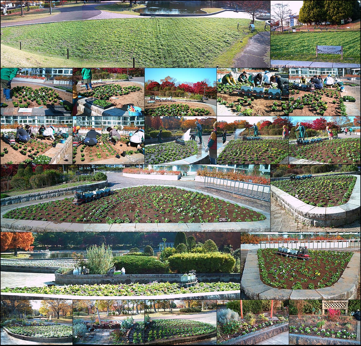 植込みから2週間の例会、株も大きくなった気が、IB肥料を散布。桜守花壇には防霜シート、入口花壇の宿根草の茎を切って冬支度了。