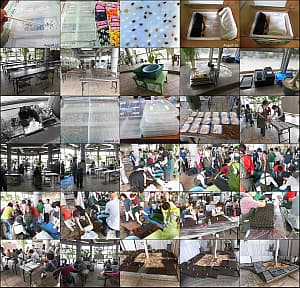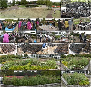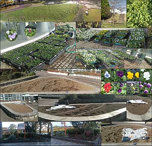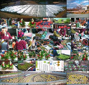 快晴の例会、夏苗のポット上げ840株。ビオラ・ネモフィラはそろそろ終り、ゆづ桜の元に写真入看板が出来てた。Good !
